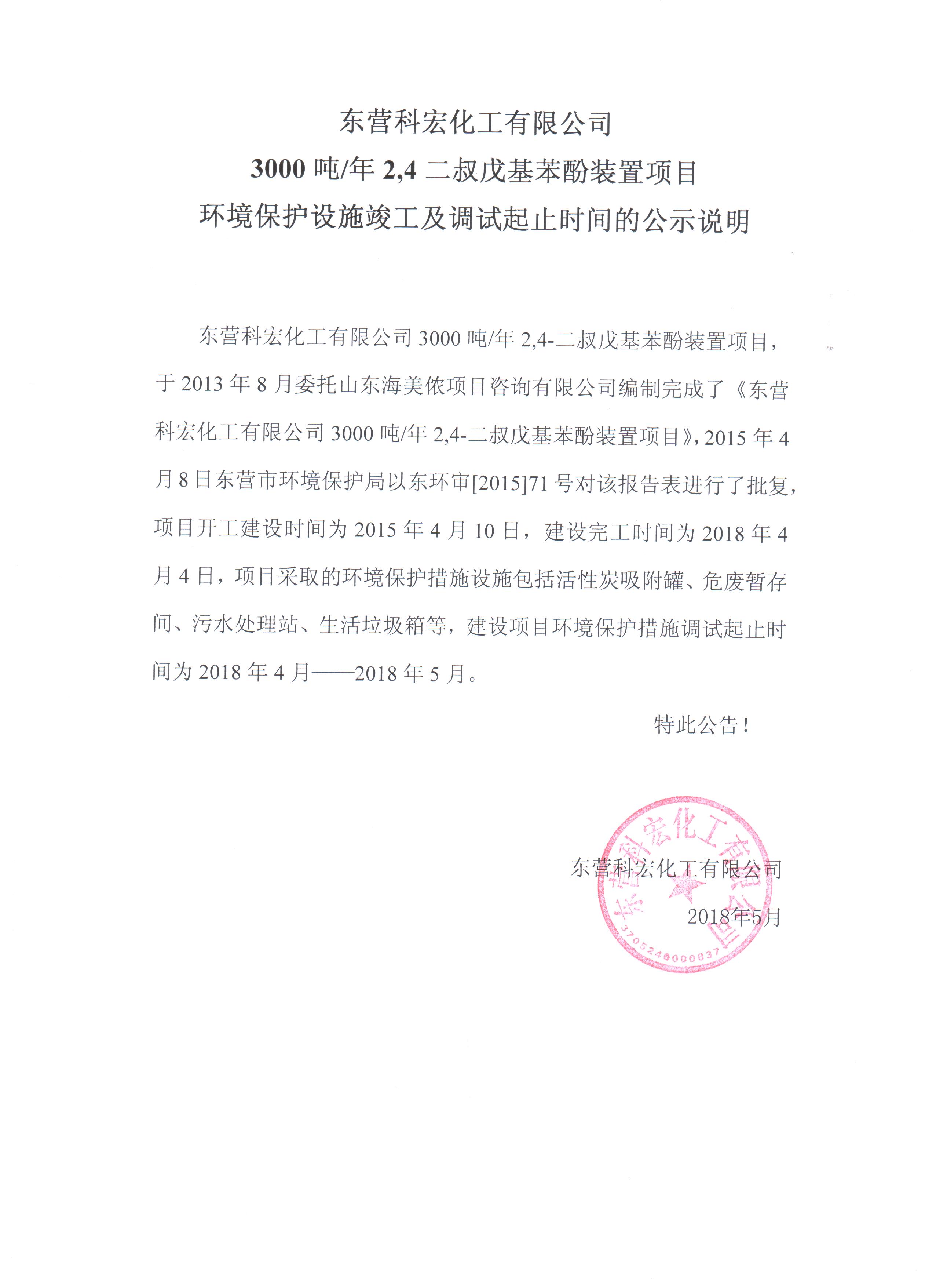 东营科宏化工有限公司3000吨/年2,4-二叔戊基苯酚装置项目,于2013年8月委托山东海美侬项目咨询有限公司编制完成了《东营科宏化工有限公司3000吨/年2,4-二叔戊基苯酚装置项目》,2015年4月8日东营市环境保护局以东环审[2015]71号对该报告表进行了批复,项目开工建设时间为2015年4月10日,建设完工时间为2018年4月4日,项目采取的环境保护措施设施包括活性炭吸附罐、危废暂存间、污水处理站、生活垃圾箱等,建设项目环境保护措施调试起止时间为2018年4月——2018年5月。
